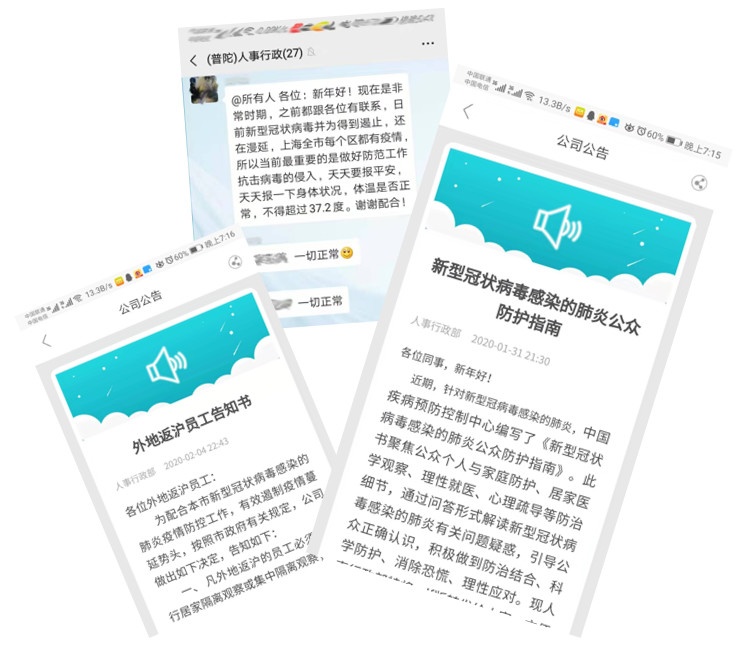 嚴(yán)格落實(shí)返滬人員2周的觀察隔離時(shí)間,安排專人落實(shí)他們的生活餐飲和體溫測(cè)量,加強(qiáng)員工宿舍的統(tǒng)一管理,控制上班人數(shù),鼓勵(lì)員工盡可能采用遠(yuǎn)程辦公的方式開展工作。